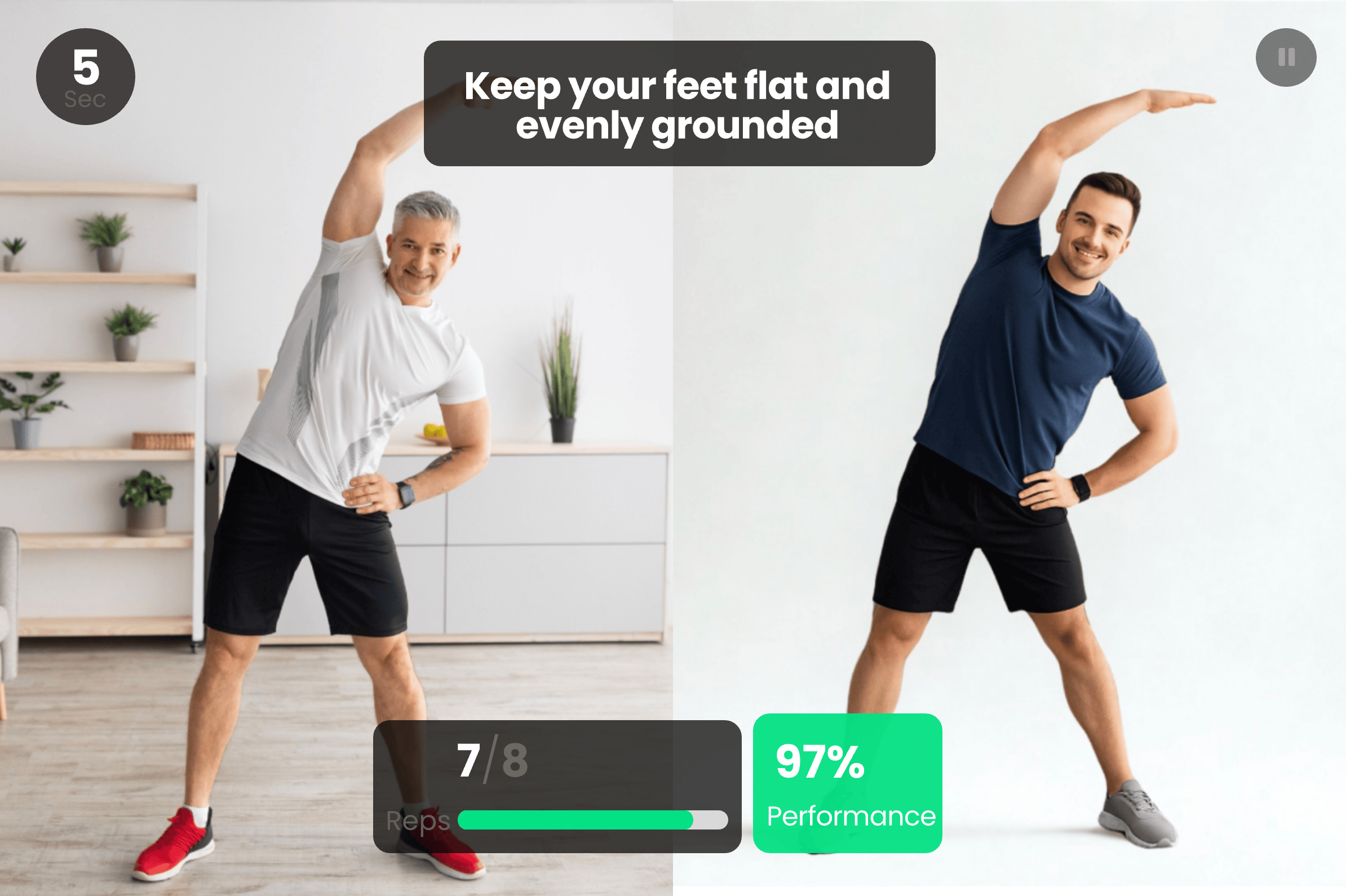Instant audio-visual cues guide the user's movement, ensuring correct form and posture.